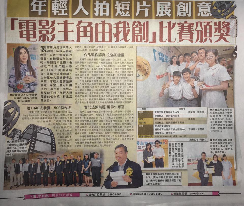 The "The Movie Character Created By Me" short film competition 2018 was initiated by Ms Pang, founder of Lisa Pang International Program Limited. Co-organised with the Hong Kong Playground Association and the Parson Music Foundation. The award ceremony was held recently. The competition was opened to students aged 12 to 17, they can participate individually or in a team of no more than three people, from November last year to April this year, attracting about 180 schools and organisations, with more than 1500 videos submitted by 1940 participants.